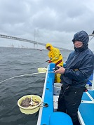 当日は、船上にて、揚げたて天ぷらで会食を楽しむ予定でしたが、あいにくの雨のため船上での宴席が叶わず急遽「ライトアジ釣り」へと内容を変更しての出船となりました。